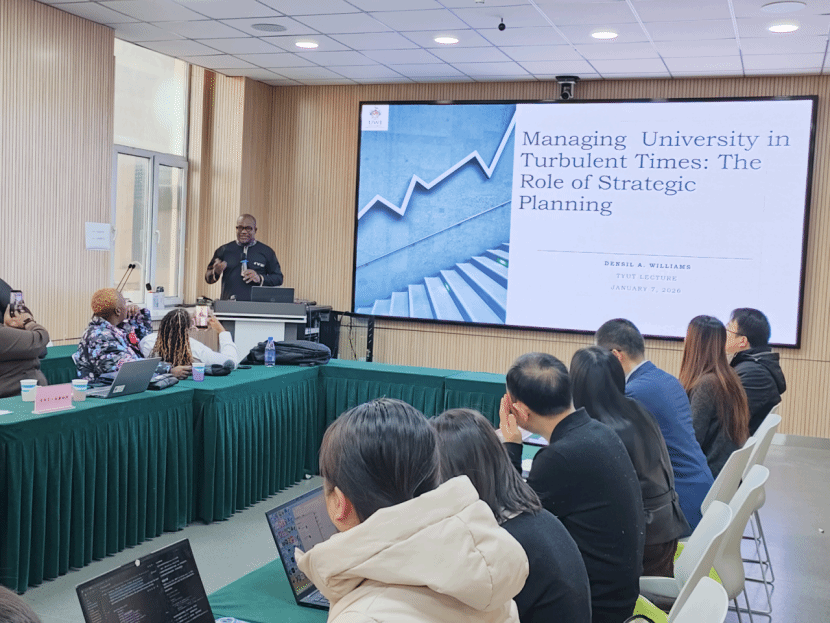 2026年1月7日上午,学院 229 会议室座无虚席。为深化国际学术交流合作,推动我校孔子学院高水平发展,我校客座教授、牙买加西印度大学莫纳分校校长丹西尔・A・威廉姆斯(Dansil A. Williams)教授受邀带来题为《动荡时期的大学引领:战略规划的作用》(Leading Universities during Turbulent Times: The Role of Strategic Planning)的专题讲座。牙买加西印度大学莫纳分校孔子学院中方院长冯雷、我校国际合作处副处长李万峰、我校威尼斯9499登录入口党委书记闫新、院长栗继祖教授、副院长陈怀超教授及两校师生代表共同参加了此次活动。