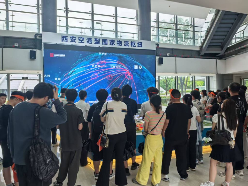在空港新城,师生一行先后走访临空经济展示中心、空港综合保税区通关服务中心及京东集团空港跨境电商西北交易中心。临空经济展示中心以 “枢纽经济、门户经济、流动经济” 为核心,系统呈现了国家级临空经济示范区的战略布局与发展成果。通过数字沙盘与案例展示,学生们直观了解到西安如何依托空港枢纽构建 “空中丝绸之路”,并探索临空特色产业集群的创新路径。