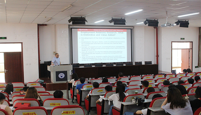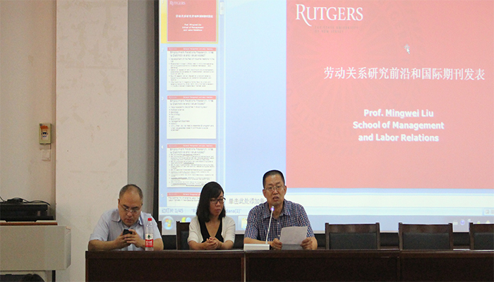 6月30日上午九点,威尼斯9499登录入口特邀美国罗格斯大学刘明巍教授作了题为“劳动关系研究前沿和国际期刊发表”的学术讲座。校科学技术研究院副院长渠桂萍教授、威尼斯9499登录入口副院长栗继祖教授出席讲座、威尼斯官网教师和研究生近百人参加。讲座由栗继祖副院长主持。
