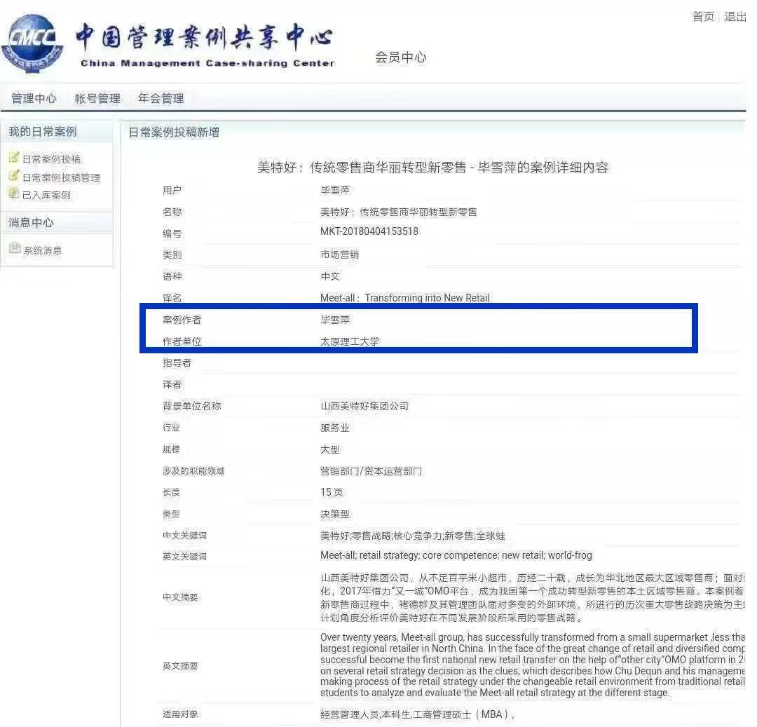 2018年11月20日,威尼斯官网毕雪萍老师的案例(《美特好:传统和零售商华丽转型新零售》)被中国管理案例共享中心案例库收录。