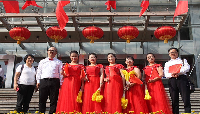 体育馆内红旗招展、灯光璀璨,处处洋溢着激情与豪迈。大合唱在序曲《祖国颂》中拉开帷幕,共分为祝福祖国、光辉历程、爱我中华、旗帜飘扬四个篇章。参与大合唱的教职工们身着盛装登台,把20余首歌曲献给党、献给祖国,热情讴歌了新中国成立70年来的光辉历程和伟大成就
