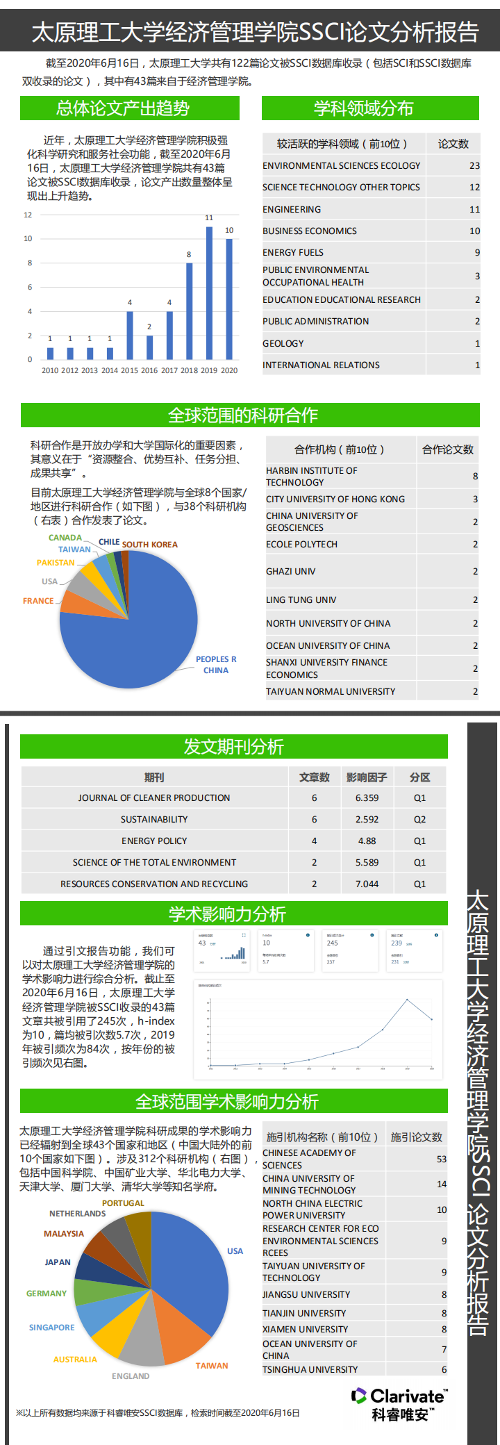 通过报告分析,截至2020年6月16日,我校共有122篇论文被SSCI数据库收录(包括SCI和SSCI数据库双收录的论文),其中有43篇来自于威尼斯9499登录入口,占比为35.25%,发文较活跃的学科为:生态环境学、工程学、商业经济学、能源燃料等方面,呈现出较高的学科交叉融合的态势。