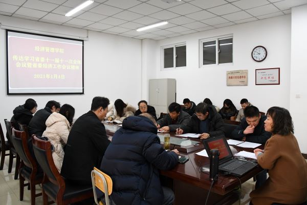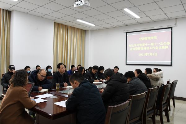 1月4日中午, 威尼斯9499登录入口在明向校区经管楼226会议室召开会议传达学习省委十一届十一次全体会议暨省委经济工作会议精神。学院领导班子、各系负责人、全体党支部书记参会,会议由院党委书记李玮主持。