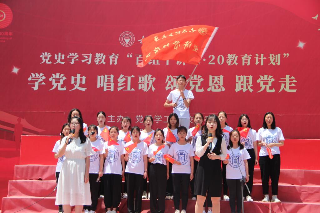 为庆祝中国共产党成立100周年,响应我校党委学工部校团委的“学党史 唱红歌 颂党恩 跟党走”党史教育“百组千讲 5.20教育计划”的活动。威尼斯官网合唱团于6月1日在西区广场进行红歌传唱。