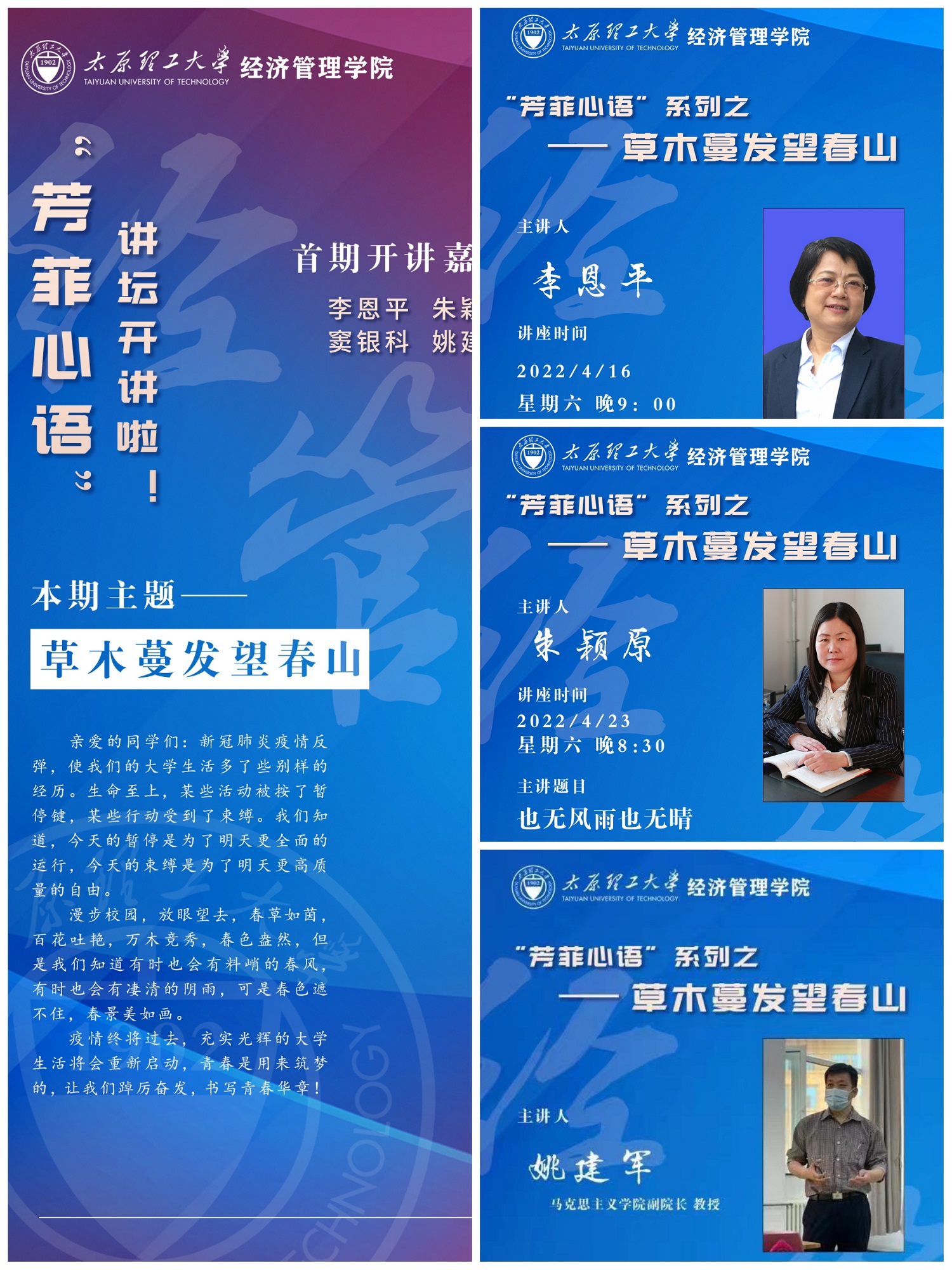 4—5月,在因疫情学校封闭管理期间,为丰富在校学生的校园生活,缓解学生封闭期间的负面情绪,同时喜迎120周年校庆的到来,威尼斯9499登录入口举办“芳菲心雨”系列讲坛之——“草木蔓发望春山”专题,讲坛邀请到我校四位深受学生喜爱的重量级教授,为经管学子在抗疫关键时期奉献上精神和学识的“饕餮盛宴”。
