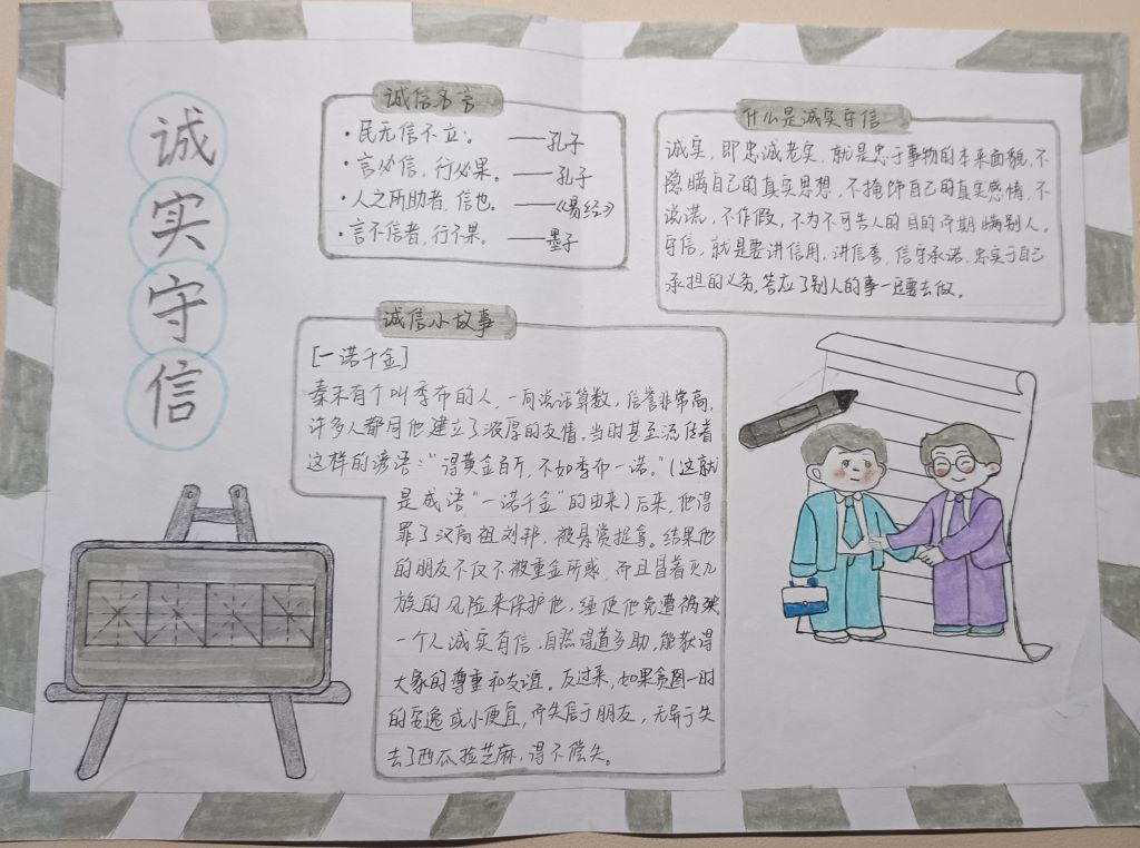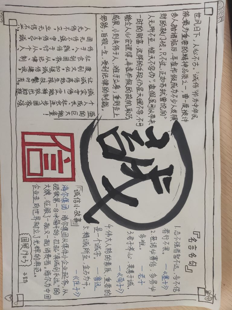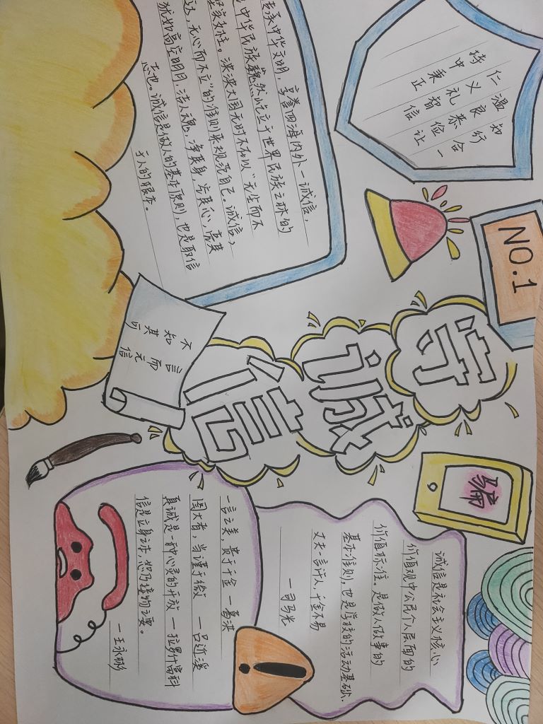 在活动期间,各班级充分发挥自身的特点,分别举办了多项丰富多彩的诚信教育主题活动。其中,物流2101班在“荣诚于学寓教于信”的主题班会上,通过精彩的ppt展示、经典案例分析,用生动的语言向同学们详细讲解了考试作弊的危害,引导同学们积极维护诚信,树立诚信意识。图文并茂的手抄报,妙笔生花的征文,同学们以形式鲜明的“诚实守信”、“诚信伴我行”等内容宣传诚信,以文采飞扬的笔触,探究诚信与成功的关系,赢得了广泛的关注和好评。