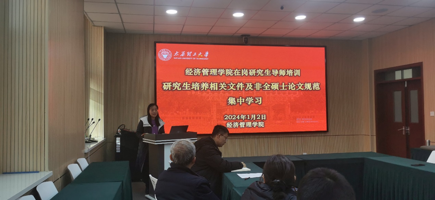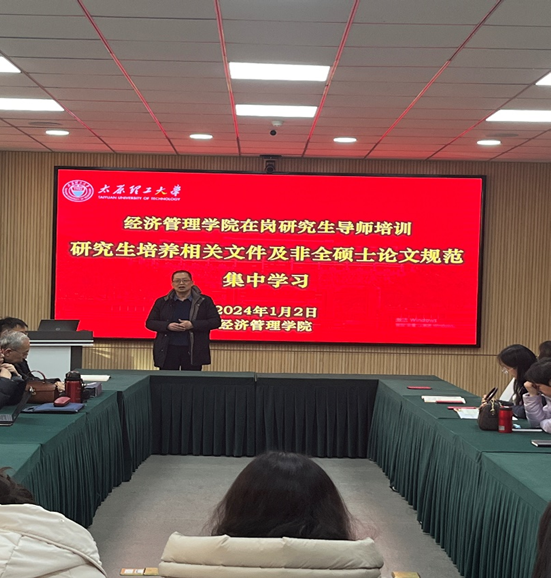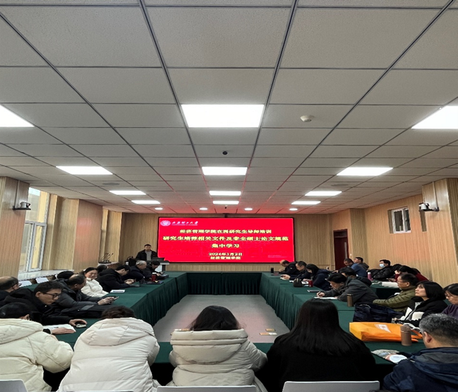 为全面落实研究生导师立德树人职责,加强研究生导师队伍建设,提高导师指导和培养研究生的能力,切实保障研究生的培养质量,按照学校研究生院的安排,2024年1月2日,威尼斯9499登录入口研究生导师培训会在经管学院229会议室召开。威尼斯9499登录入口党委书记闫新、院长栗继祖、副院长陈怀超、副院长姚西龙、教科办主任刘霄燕及50多位全院研究生导师和和拟申请研究生导师聘任资格的老师加了会议,会议由副院长姚西龙主持。会议分为两个环节,第一个环节是学院领导领学研究生培养的相关制度文件;第二个环节是研究生培养的关键事项及非全日制研究生论文写作规范的说明。