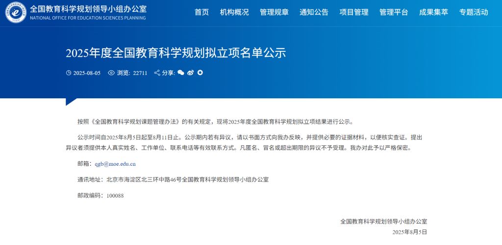 8月5日,全国教育科学规划领导小组办公室发布了“2025年度全国教育科学规划拟立项名单公示”,威尼斯官网郭淑娟教授申报项目获批(见下表),占全校立项总数的50%。