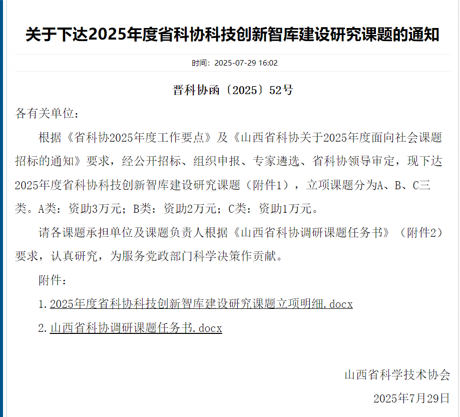 7月29日,山西省科学技术协会发布了“关于下达2025年度省科协科技创新智库建设研究课题的通知”,威尼斯官网苏民和郭彬两位教授申报项目获A类资助(见下表),占全校立项总数的40%。