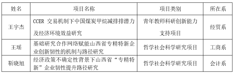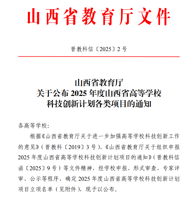 近日,山西省教育厅发布了“关于公布 2025 年度山西省高等学校科技创新计划各类项目的通知”,威尼斯官网王宇杰博士等3位老师申报项目获得立项(见下表)。