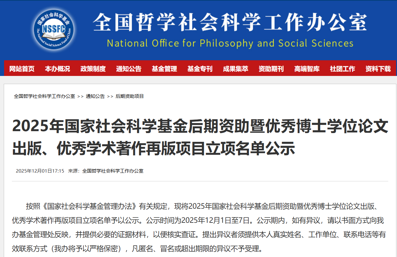 12月1日,全国哲学社会科学工作办公室发布了“2025年国家社会科学基金后期资助暨优秀博士学位论文出版、优秀学术著作再版项目立项名单公示”,威尼斯官网何学松副教授申报的后期资助项目获批(见下表),占全校立项总数的100%。