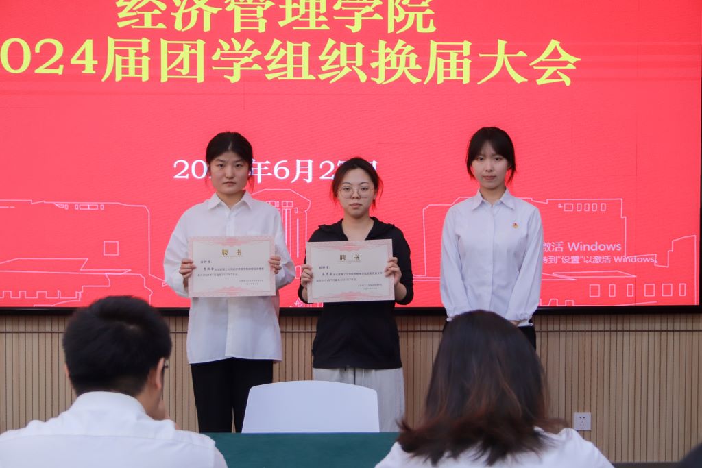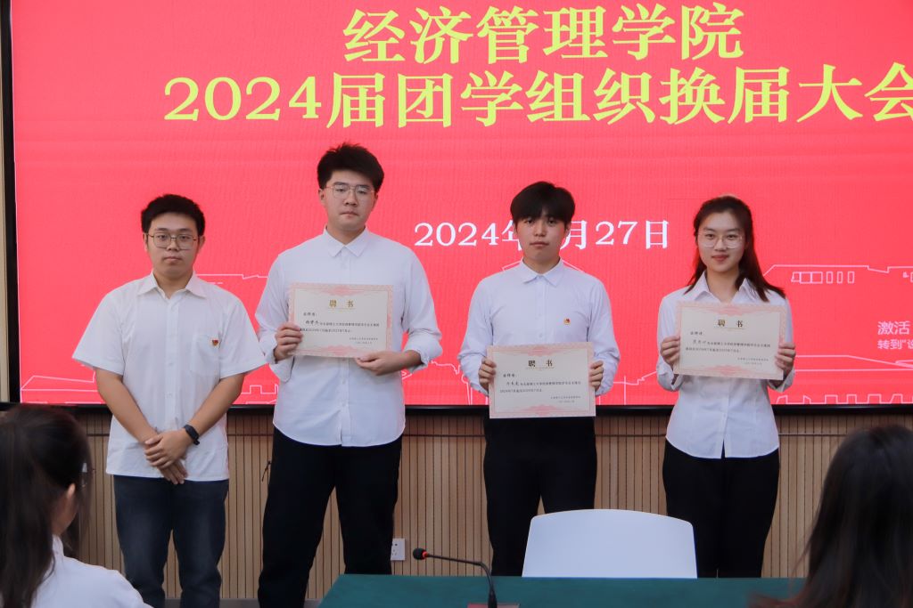 大会第三项,举行2024届团学干部就任仪式。2024届学生会主席亓文龙和研究生会主席陈浩昕作为代表发言,他们表示团学组织是学生成长成才的舞台,将团结同学们以饱满的热情、昂扬的斗志、务实的作风,为威尼斯9499登录入口的发展贡献自己的力量!随后,由2023届主席团与部长团成员为新一届主席团、部长团成员颁发聘书。